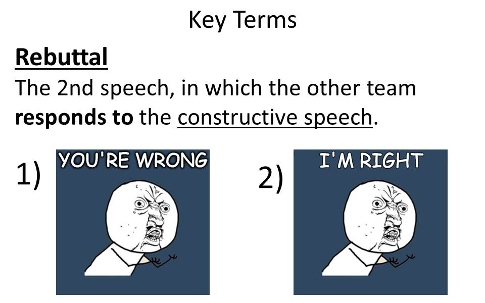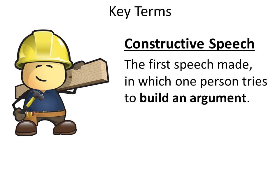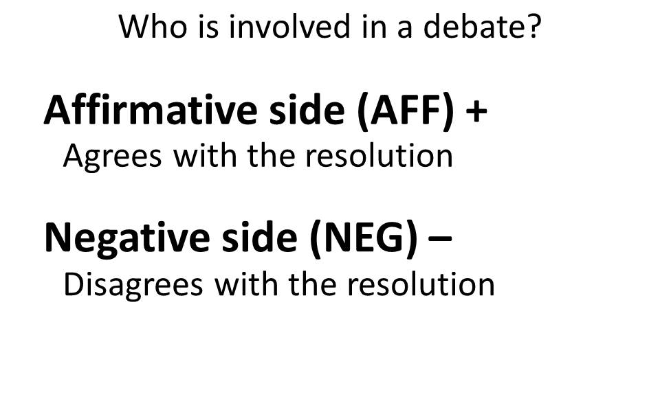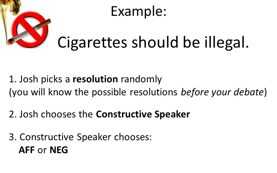 - Remind students that the Constructive Speaker chooses to agree or disagree with the resolution. It’s entirely possible for the Constructive Speaker to DISAGREE with the resolution, which means the Rebuttal Speaker would then AGREE with the resolution. This is always confusing at first for students, but they catch on fast.