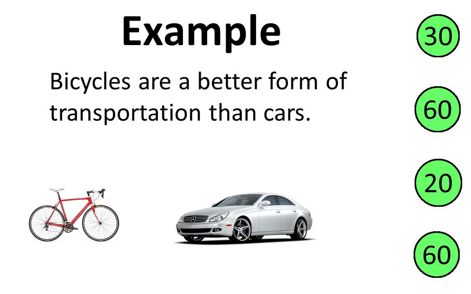 - Remind students of our Bicycles vs. Cars debate and how we BOTH had good points. Rain shmain!