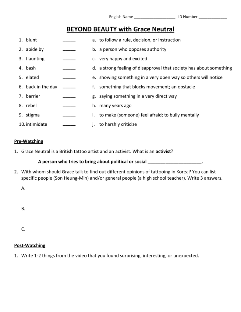 - Hand out BEYOND BEAUTY with Grace Neutral Vocab and Questions. Have students complete the vocabulary and then review.