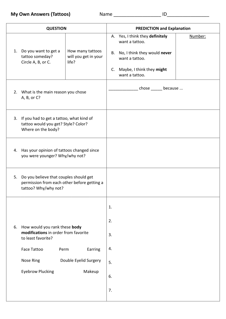 - Use this as a transition to having students think about their classmates’ and their own opinions about tattoos.