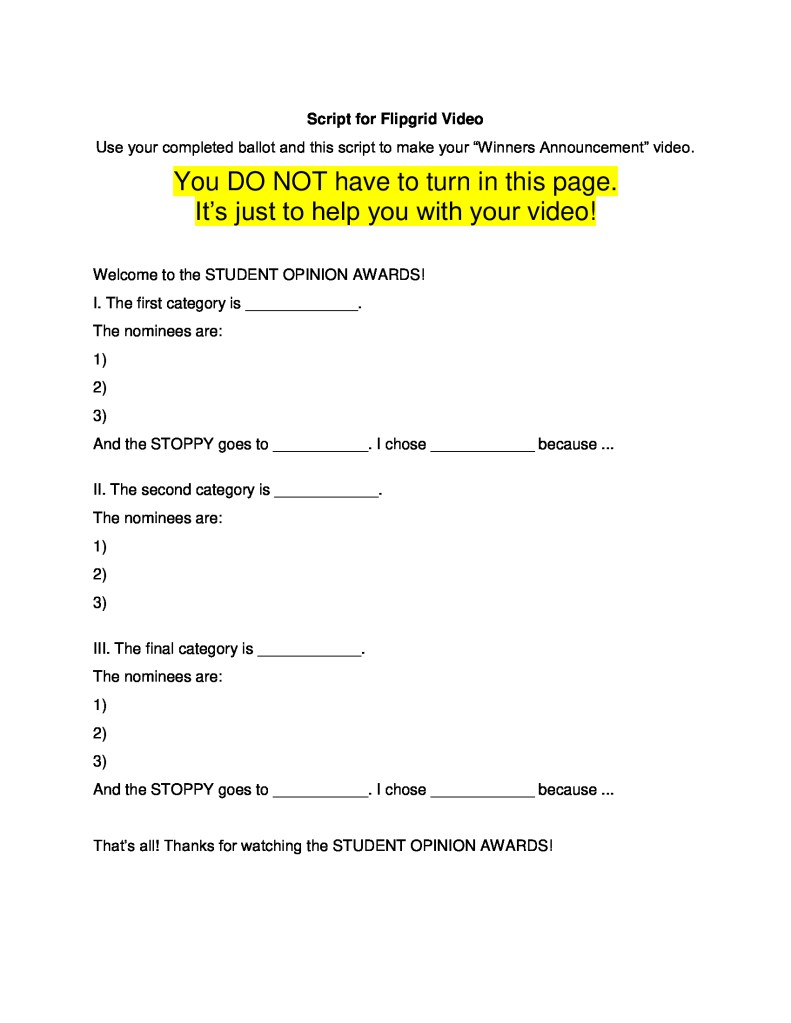 - Tell student that the Ballot must be completed and submitted by the end of class, but the Script is just to assist them when they make their videos.