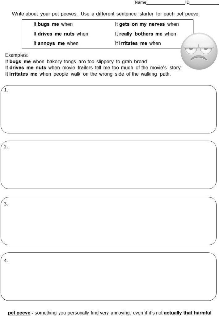 - Hand out the following page for students to complete. Here they will use the language we warmed-up with at the start of class. Some students will think of 4 (or more), some fewer, and that’s okay! As long as every student identifies and writes about at least 1 or 2 pet peeves, that’s enough.
