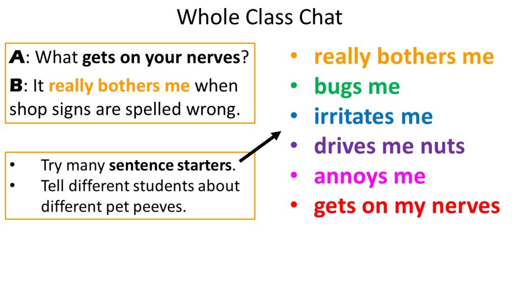 - Before sharing your examples, mention to students that they will soon share their own. This will enable them to start thinking about their own pet peeves in advance of actually writing them down.