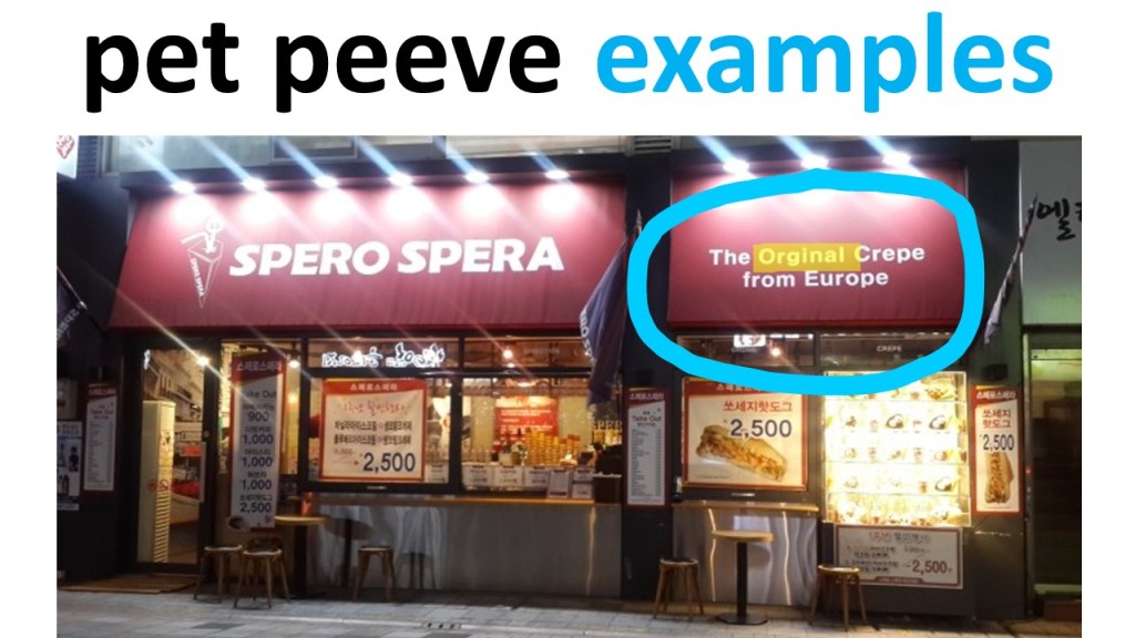- Introduce the concept of pet peeves, with your own personal examples. Some of my pet peeves include misspellings on store signage, bakery tongs that are too slippery, and “Do Not” symbols in which the thing we are supposed to not do is in front of the diagonal red line, rather than behind it. I know, I’m crazy!