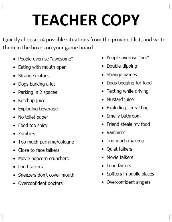 - Now that students are armed with several pet peeves to complain about, it’s time to share them with their classmates. Introduce the mingle activity with the following instructions and handout: