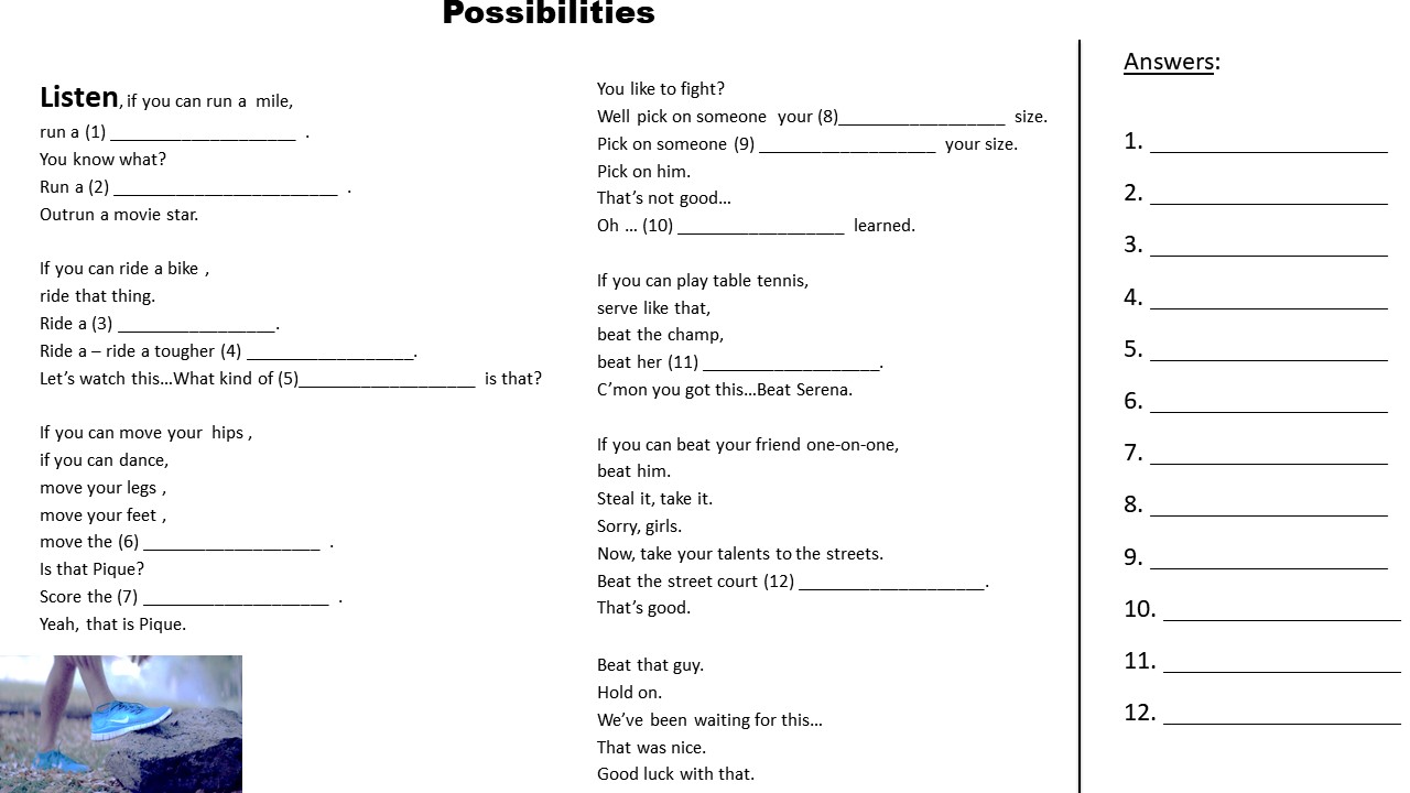 - With students seated in pairs, give large white paper (B4) and Nike “Possibilities” (my name for the commercial) gap fill handout. Tell students we will listen to “something” and they should try to fill in the blanks. Then play the AUDIO only of the Nike Possibilities commercial.