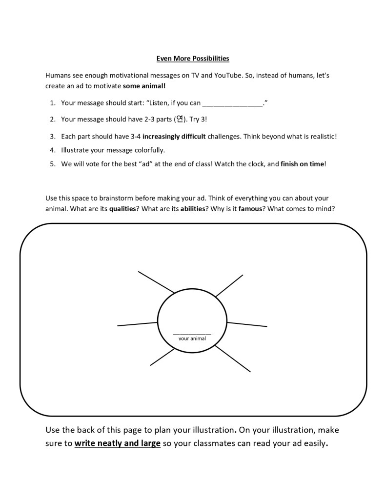 In this imagination-stretching ELL lesson, students play the role of marketing team leaders tasked with creating an advertisement intended to induce a feeling of motivation. But there’s a twist. Rather than creating motivational ads for humans, each pair of students creates an ad aimed at a different animal. The lesson draws on the students’ background knowledge and pushes them to summon their creativity to make something unique and awesome.