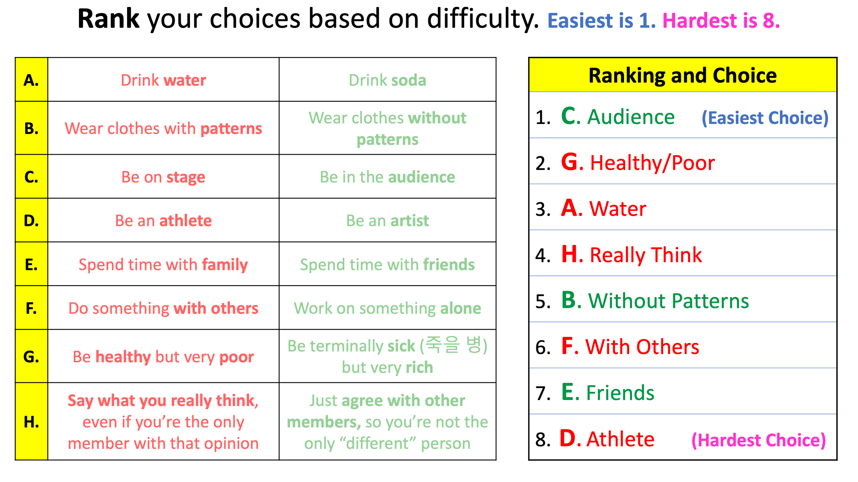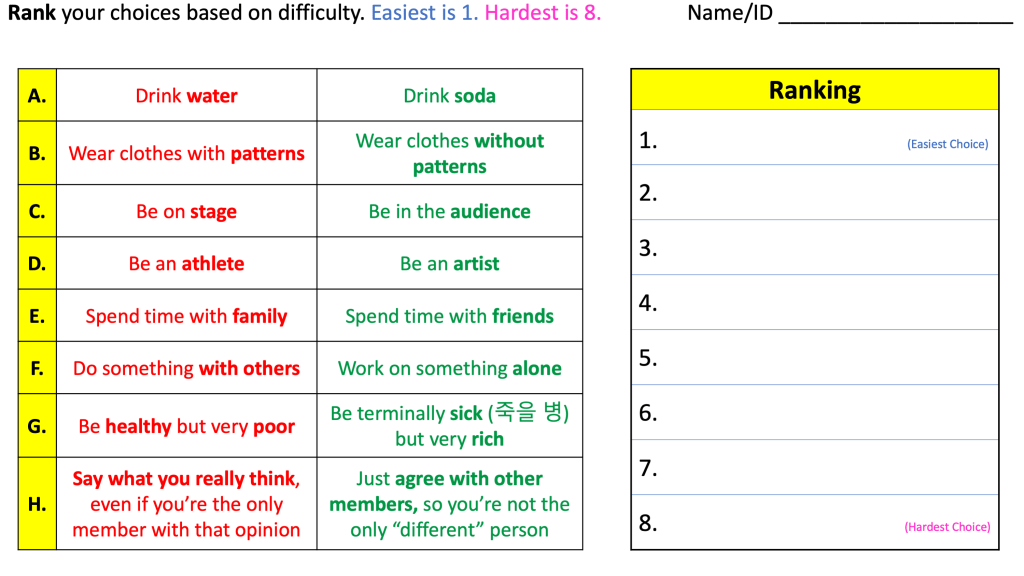 - Tell students to rank the difficulty of their choices, using my PPT example.