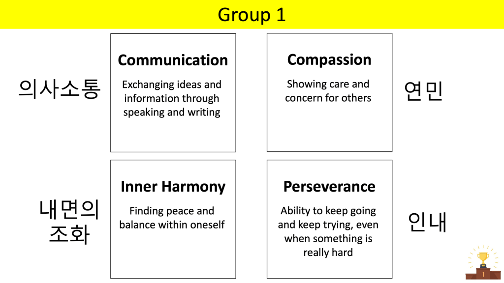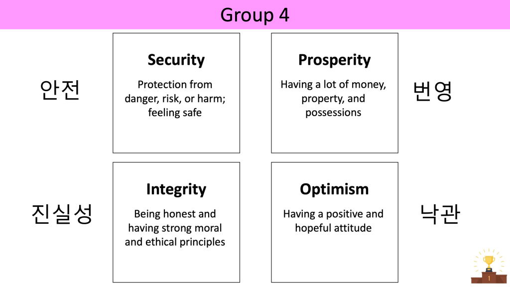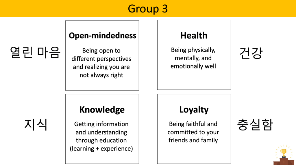 - One student from each group quickly presents their top value.