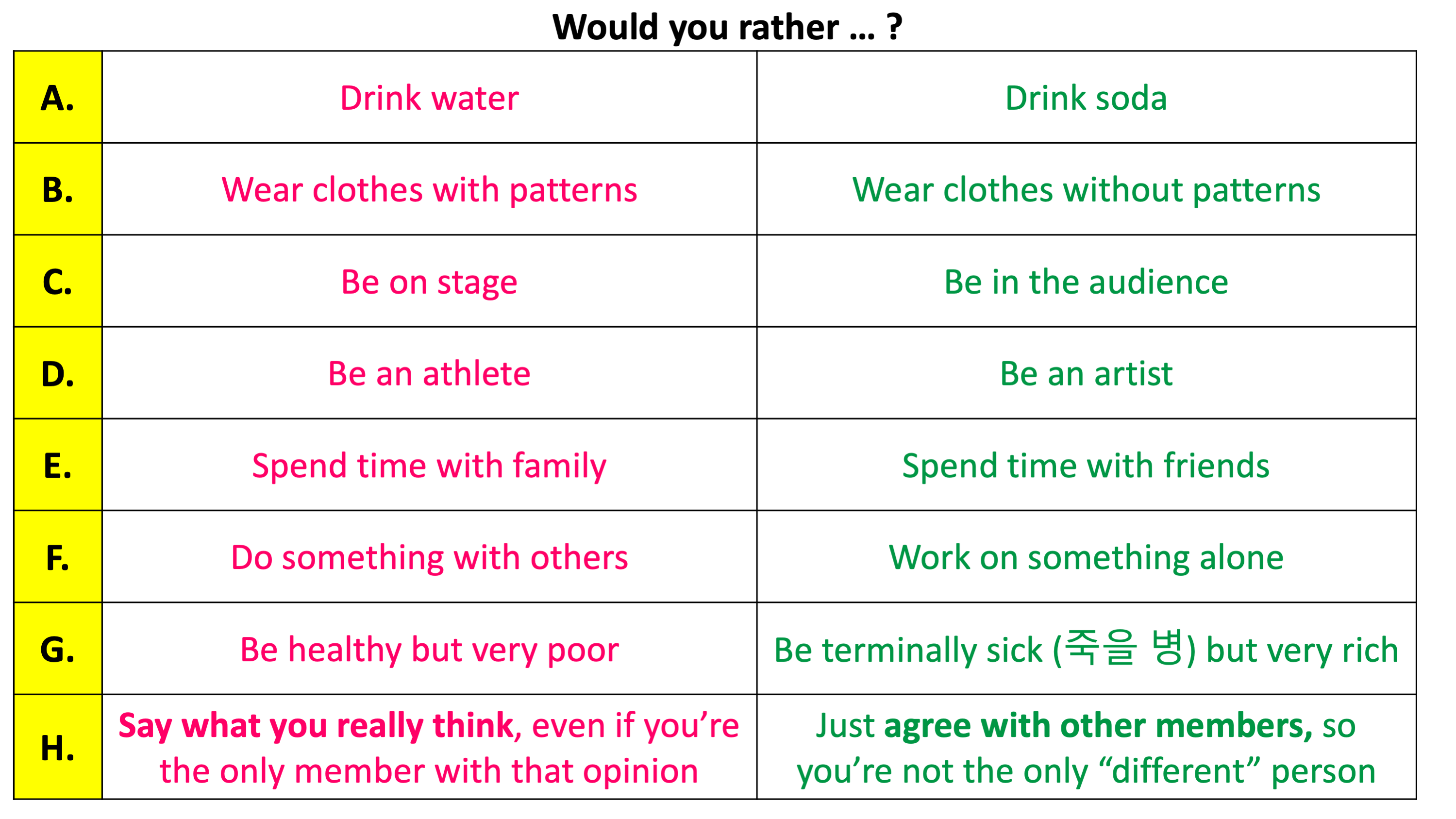 - Using PPT, proceed through a series of Would You Rather questions. Record their responses on board in tally form, to show the overall orientation of the class.