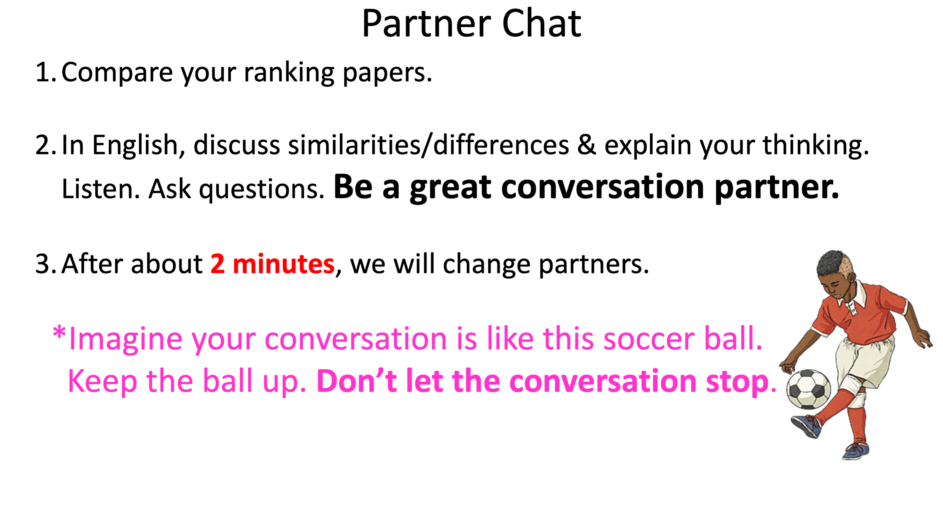 - Tell students they are going to use their ranking pages to have short discussions with different partners. Use PPT to explain process and emphasize the importance of being a great convo partner.